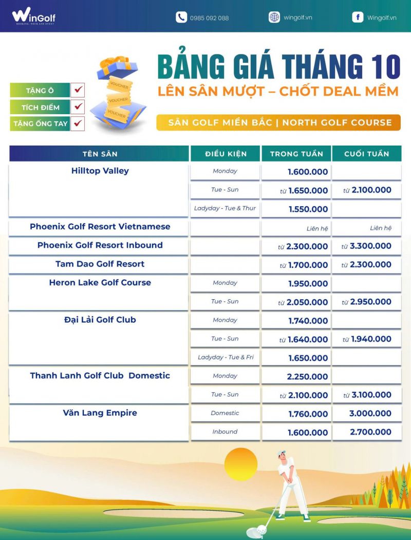 Wingolf hân hạnh mang đến bảng giá sân golf miền Bắc mới nhất, áp dụng từ đầu tháng 10, với nhiều mức giá ưu đãi dành cho golfer nội địa và inbound.